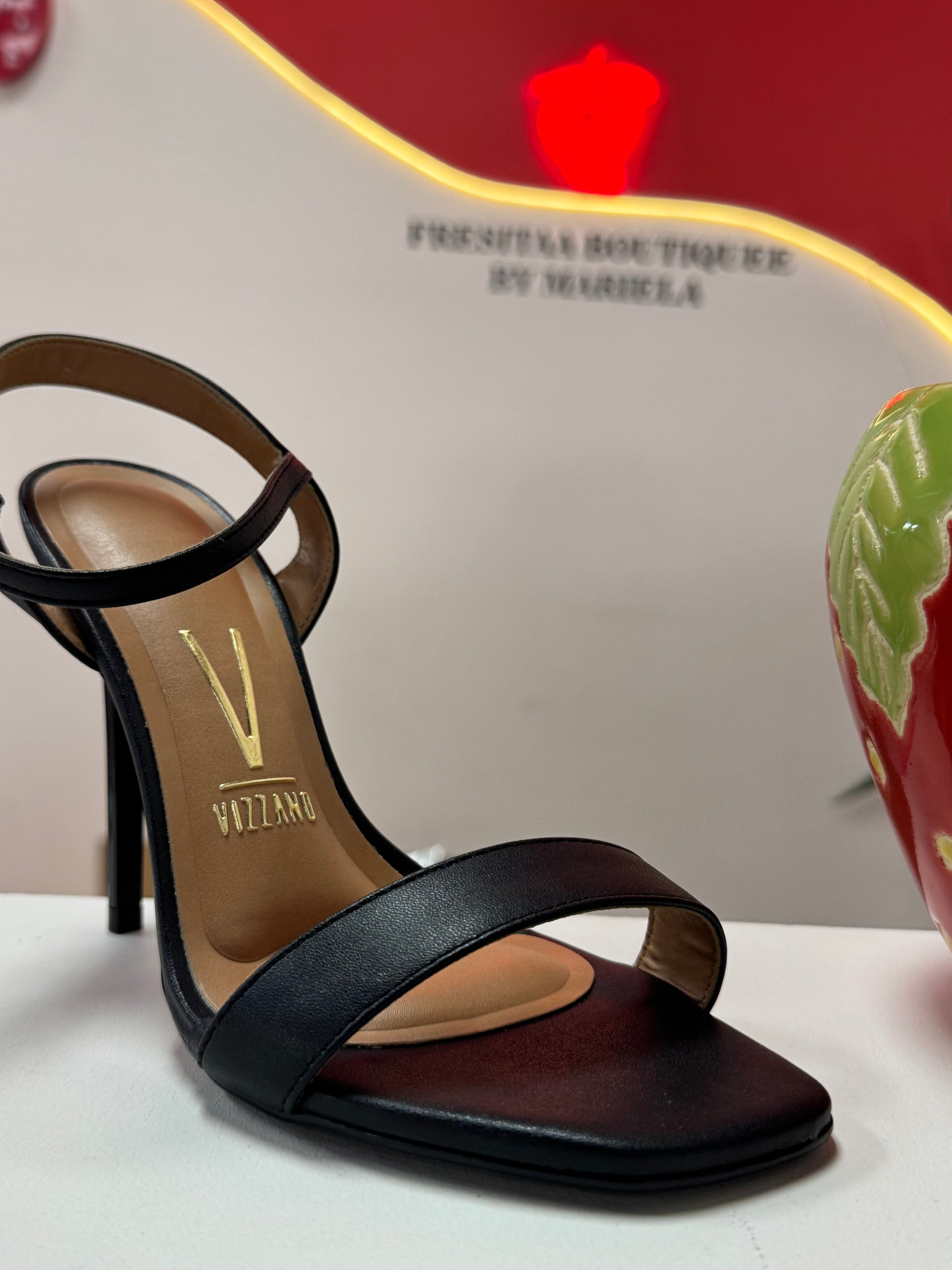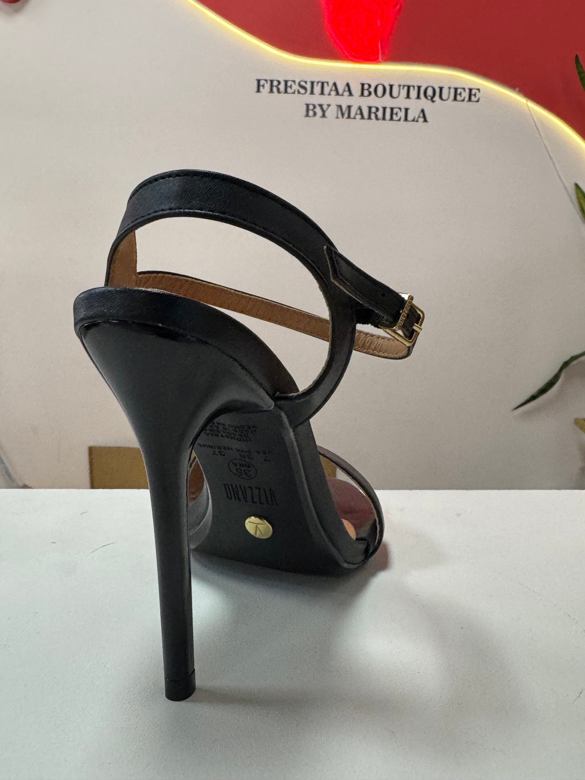 HIGH HEEL SANDAL, ELEGANT AND SOPHISTICATED, MADE IN BLACK, A COMFORTABLE SANDAL BECAUSE IT HAS A SOLE WITH SOFT CUSHIONING IN NUDE TONE, IT HAS ADJUSTABLE STRAPS, LIGHTWEIGHT AND FEATURES A BRAND DETAIL IN GOLD TONE.