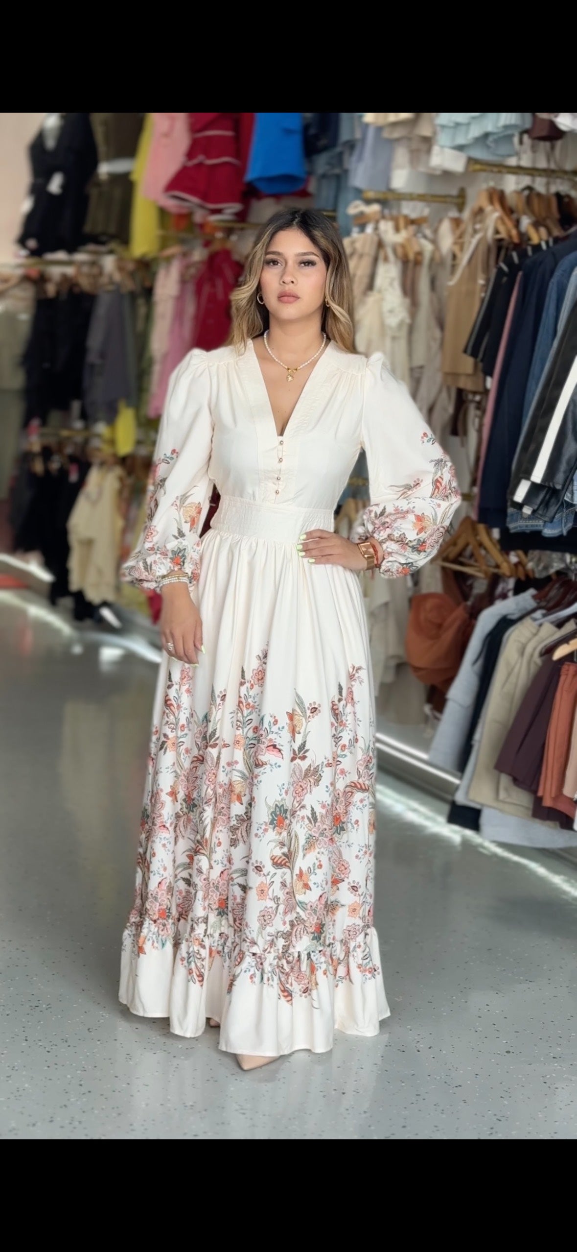 Long dress, with flowers on the bottom, its fabric is fresh