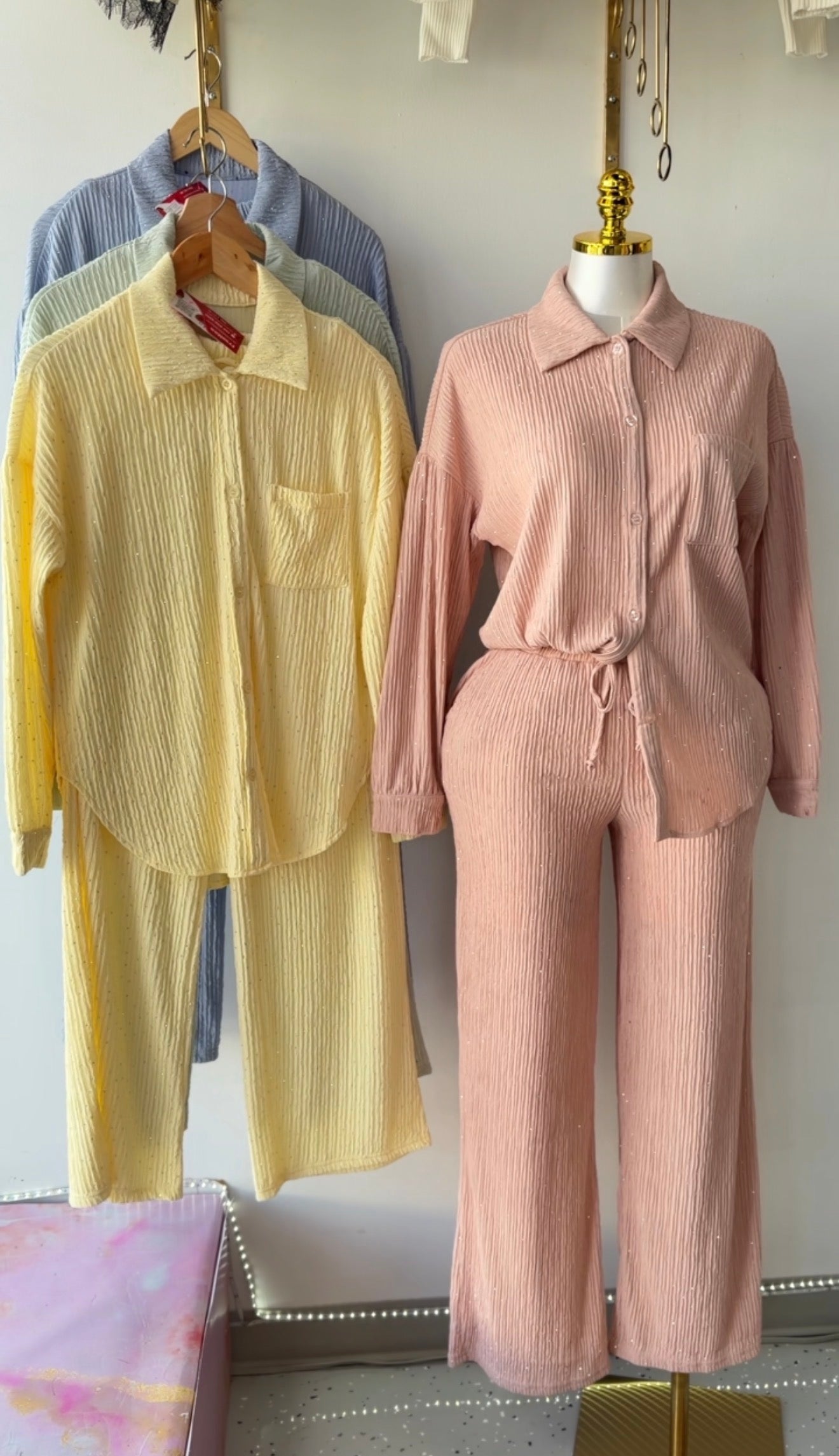 Elegant pink two-piece set featuring a long sleeve top and wide-leg pants. Made with a soft fabric and subtle shimmering dots throughout the material, adding a touch of sparkle. Perfect for casual chic looks, outings, or special occasions. ✨